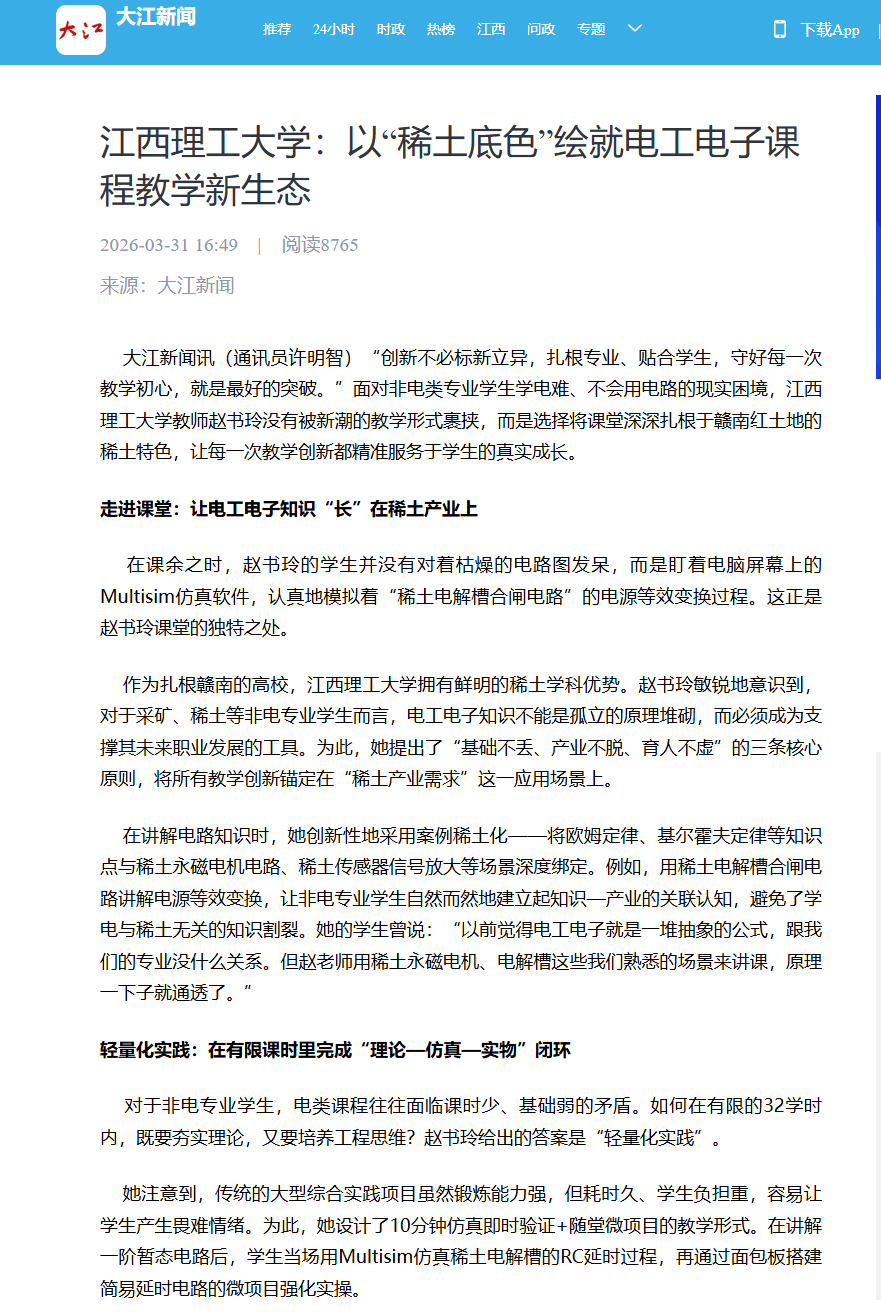 大江新闻讯(通讯员许明智)“创新不必标新立异,扎根专业、贴合学生,守好每一次教学初心,就是最好的突破。”面对非电类专业学生学电难、不会用电路的现实困境,完美网页版教师赵书玲没有被新潮的教学形式裹挟,而是选择将课堂深深扎根于赣南红土地的稀土特色,让每一次教学创新都精准服务于学生的真实成长。