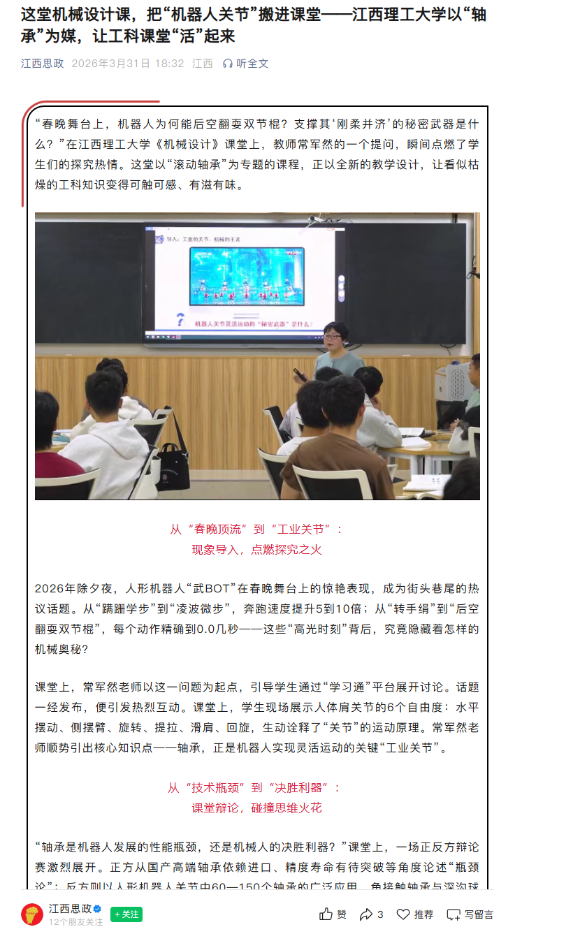“春晚舞台上,机器人为何能后空翻耍双节棍?支撑其‘刚柔并济’的秘密武器是什么?”在完美网页版《机械设计》课堂上,教师常军然的一个提问,瞬间点燃了学生们的探究热情。这堂以“滚动轴承”为专题的课程,正以全新的教学设计,让看似枯燥的工科知识变得可触可感、有滋有味。