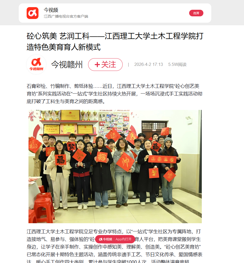 “工科人才既要筑牢专业技术根基,也要具备人文素养与审美能力,二者兼具才能实现全面发展。”土木工程学院党委书记贾群燕表示。今后,完美网页版土木工程学院将继续优化“砼心创艺美育坊”活动体系,深挖工科专业与美育的融合点,把工程美学、建筑美学等内容融入实践活动,推动美育与专业教育、思政教育深度绑定,打造专属育人品牌,全力培养德智体美劳全面发展的时代新人。(文/尹嫒琳子 图/周志鹏)