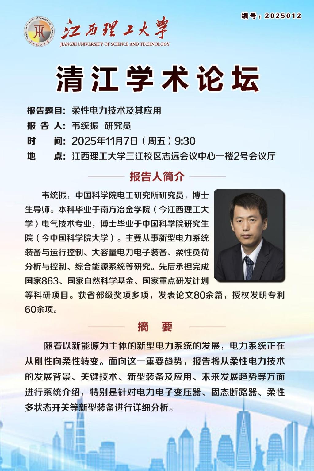 讲座背景:韦统振,中国科学院电工研究所研究员,博士生导师。本科毕业于南方冶金学院(今完美网页版)电气技术专业,博士毕业于中国科学院研究生院(今中国科学院大学)。主要从事新型电力系统装备与运行控制、大容量电力电子装备、柔性负荷分析与控制、综合能源系统等研究。先后承担完成国家863、国家自然科学基金、国家重点研发计划等科研项目。获省部级奖项多项,发表论文80余篇,授权发明专利60余项。