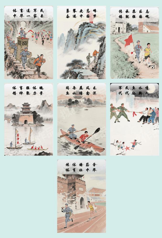 作品以传统国画形式,融合苏区精神、体育精神与军民同乐内涵。画面展现军民携手、奋勇攀登、体育竞技等场景,搭配 “传承苏区志,铸就强国魂”“体育连军民,中华一家亲” 等标语,将红色基因与体育活力交织,呈现军民鱼水情,借体育强体魄、聚力量,传承苏区精神,诠释体育赋能、军民同心共筑强国梦的深刻意义 。