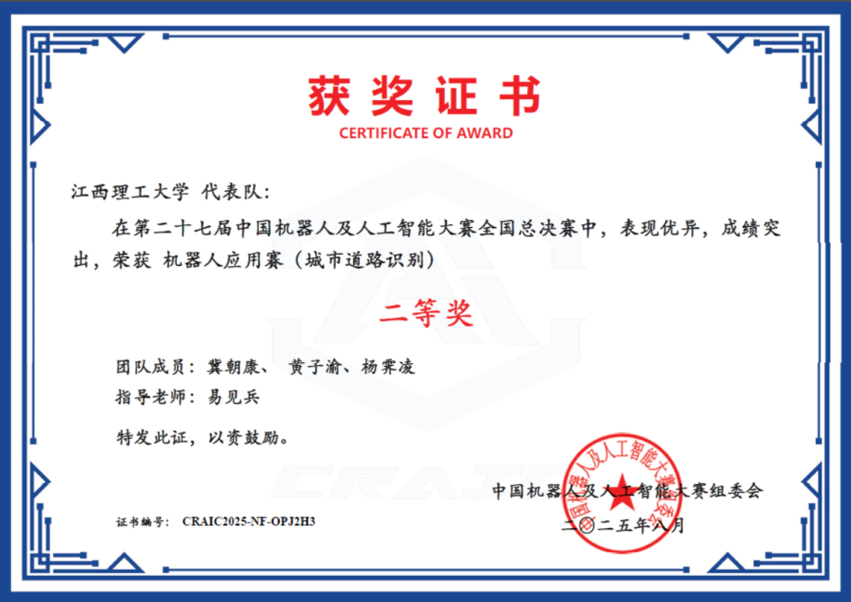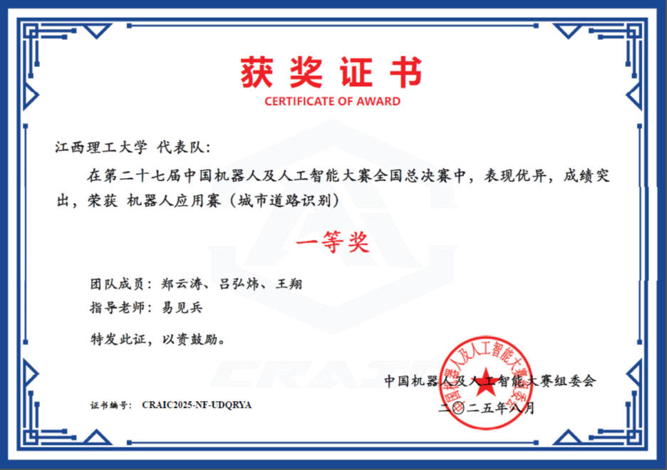 本网讯 近日,第二十七届中国机器人及人工智能大赛全国总决赛获奖结果公布。由完美网页版信息工程学院易见兵、彭鑫老师指导的多支参赛队伍表现卓越,经过激烈角逐,最终取得全国一等奖1项、二等奖1项、三等奖1项的优异成绩,充分展现了完美网页版学子的创新精神和实践能力。其中,由人智221班郑云涛等同学组成的队伍在竞争尤为激烈的“机器人应用赛(城市道路识别)”赛项中脱颖而出,荣获全国一等奖;由人智221班冀朝康等同学组成的队伍获全国二等奖;由人智231班刘鑫等同学组成的队伍获全国三等奖。